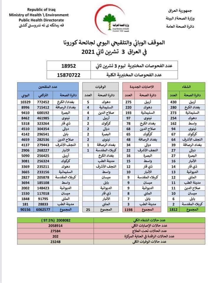 وأضاف البيان، أن "حالات الوفاة الجديدة بكورونا بلغت 25 حالة في عموم محافظات البلاد"، لافتا إلى أن "الاشخاص الذين تلقوا اللقاح خلال 24 ساعة بلغ عددهم 90156".