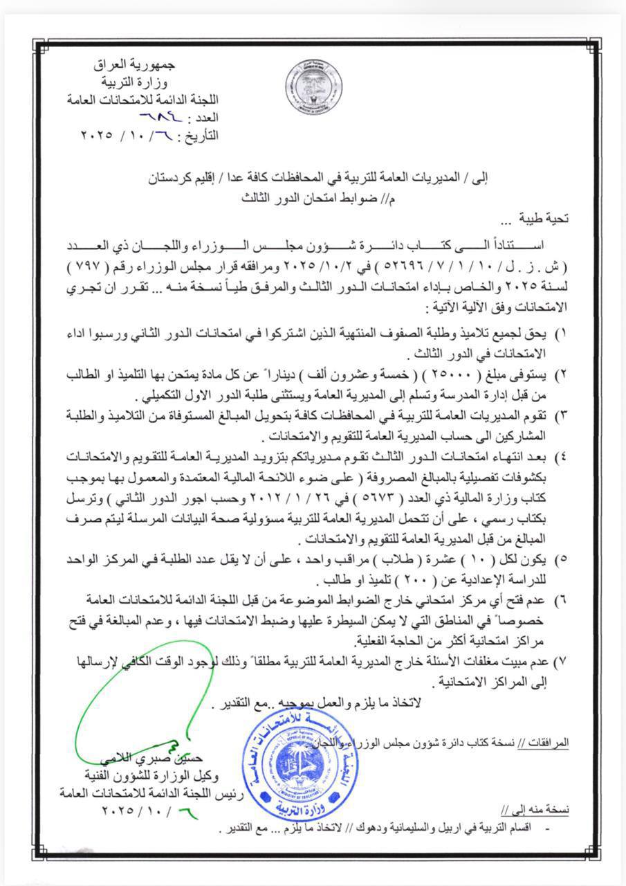 أصدرت وزارة التربية اللجنة الدائمة للامتحانات العامة، اليوم الإثنين، ضوابط وآلية أداء امتحانات الدور الثالث للمراحل الدراسية المنتهية/ لعام 2024_2025.
